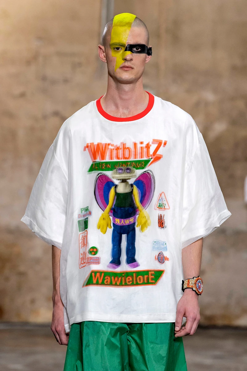 不过六君子并非正式结盟,而是兄弟登山各自努力。一战成名后,最先火力全开的是Walter Van Beirendonck,他的设计以夸张比例的剪裁搭配强烈用色着称,创立的W<(Wild and Lethal Trash)更以幽默和游走尺度边缘的图案组成的荒诞风格,备受90年代青年追捧,也为2000年后的街头怪异/解构美学(例如Vetements、Y/Project、Glenn Martens)开启前奏。