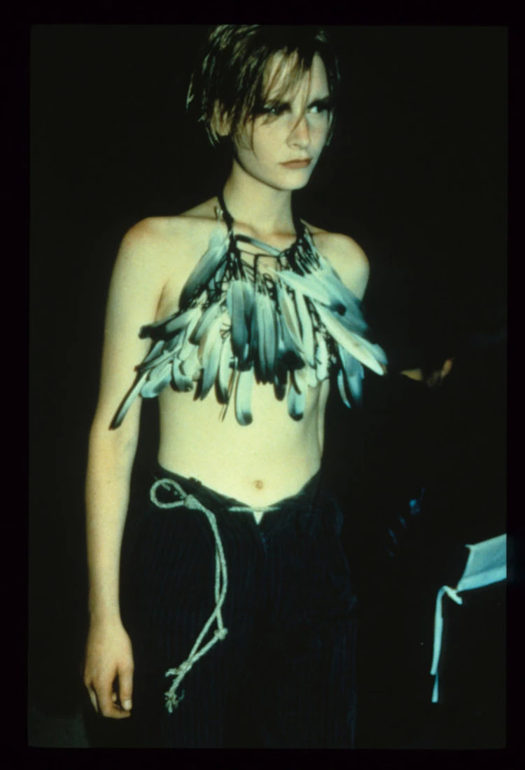 Ann Demeulemeester的作品融合了每个人内心深处的力量与脆弱之间的张力。羽毛的概念在他的作品中反覆出现,象徵这种敏感。2014年的展览中,MoMu 展出了他许多标誌性的羽毛造型作品。 设计师Ann Demeulemeester